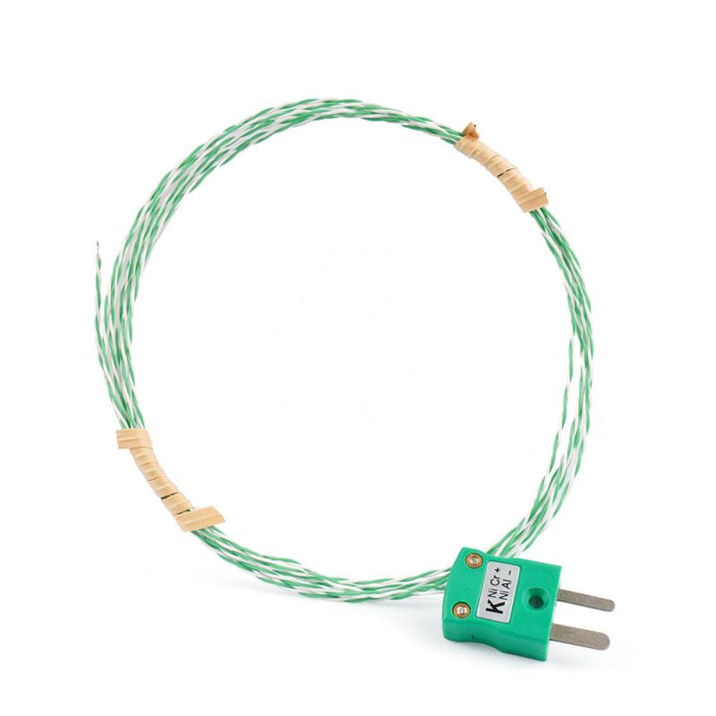 Le capteur est constitué d'une paire de fils thermocouples Chromel-Alumel (type K) de faible section, torsadés et isolés par une tresse de fibre de verre flexible. Le code couleur vert et blanc du fil conducteur est conforme à la norme internationale des thermocouples de type K, permettant une identification claire de la polarité. L'isolation en fibre de verre offre une excellente résistance thermique et une grande flexibilité, ce qui permet d'installer le capteur dans des espaces restreints et autour de géométries complexes sans risque d'endommagement de l'isolation.