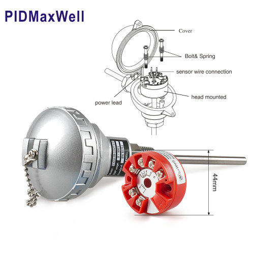 Transmetteur de température à fixation frontale Il s'agit d'un dispositif installé directement sur la tête de connexion d'un capteur de température, généralement un thermocouple ou une sonde RTD. La principale caractéristique du transmetteur de température est de convertir le signal faible et brut du capteur en un signal analogique de type 4-20 mA. Le transmetteur offre différentes options, notamment le type isolé. Version Hart, Version compatible Modbus RS-485 ; l’image ci-dessous illustre son aspect et son installation dans le connecteur.