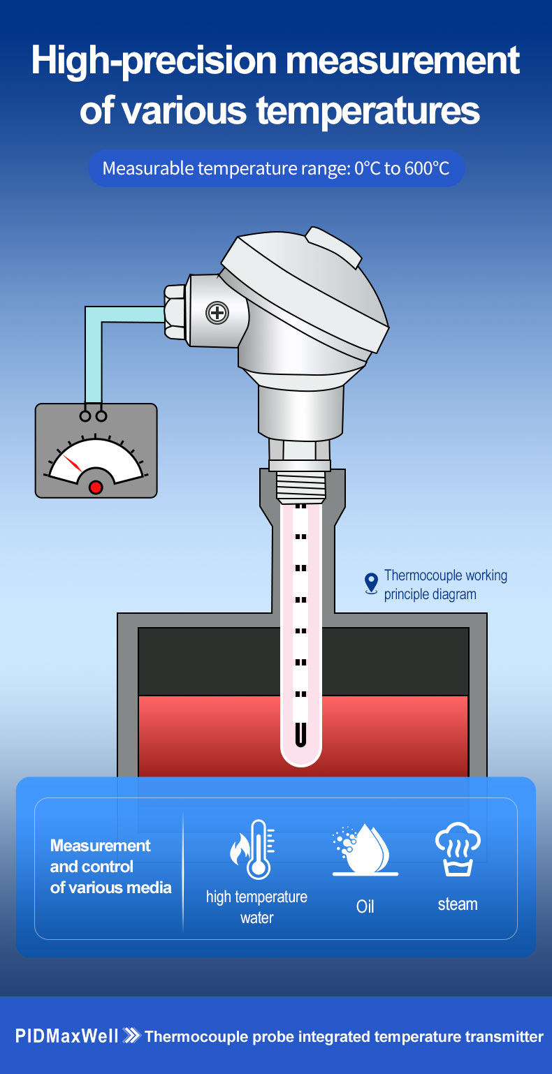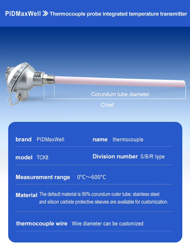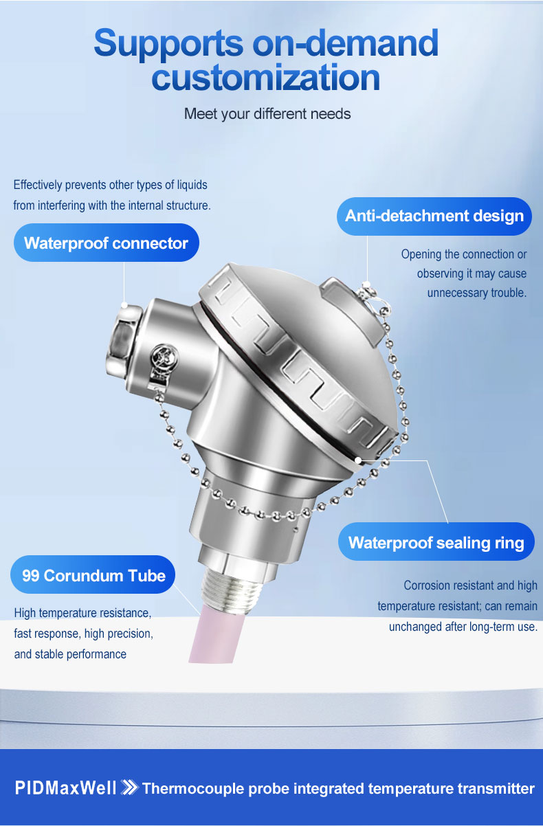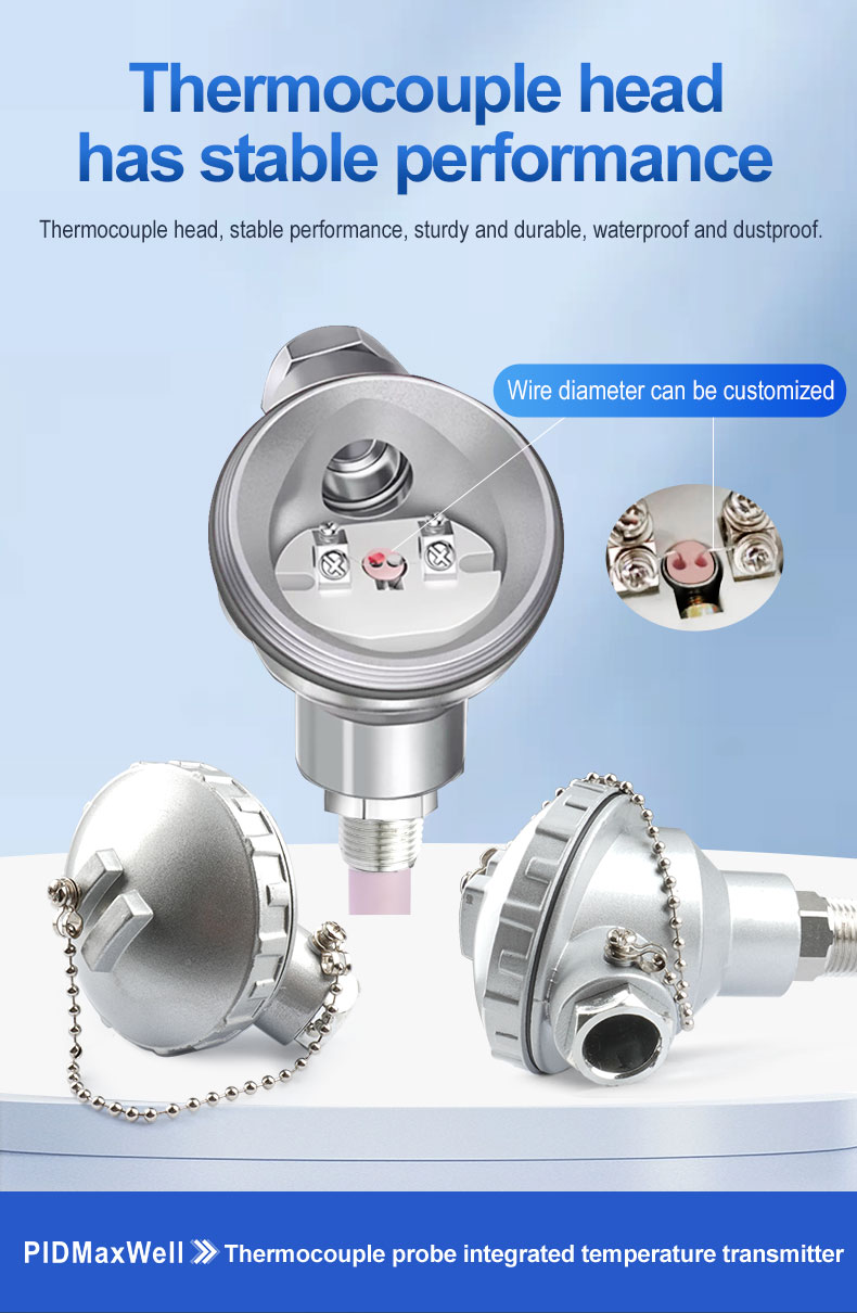Le boîtier de connexion intégré en aluminium moulé sous pression offre une protection étanche et sécurisée aux bornes du thermocouple, préservant ainsi les connexions électriques de l'humidité, de la poussière et des chocs. Le diamètre et la longueur de chaque section de sonde sont entièrement personnalisables, permettant une adaptation précise à pratiquement toutes les géométries d'installations industrielles. Faisant partie de la gamme de solutions de mesure de température PIDMaxWell, le TC-K8 est conçu pour s'intégrer parfaitement aux régulateurs de température PID, aux transmetteurs de température et aux systèmes d'acquisition de données.