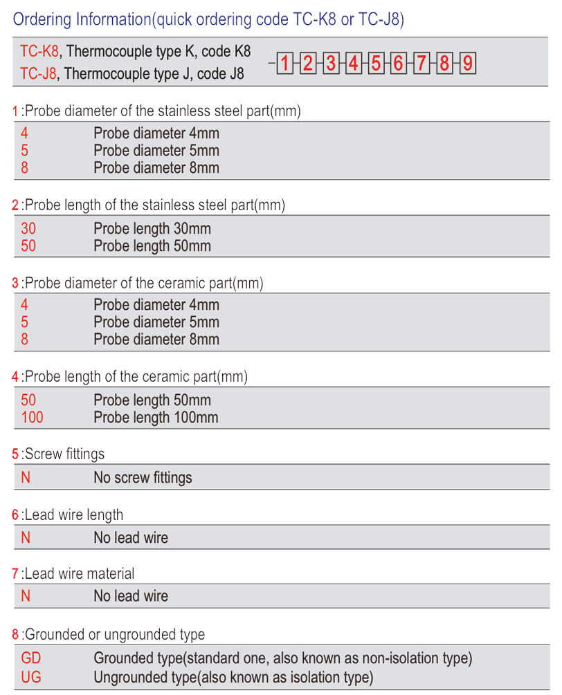 Le tableau suivant récapitule les principaux paramètres techniques du thermocouple à gaine céramique TC-K8.