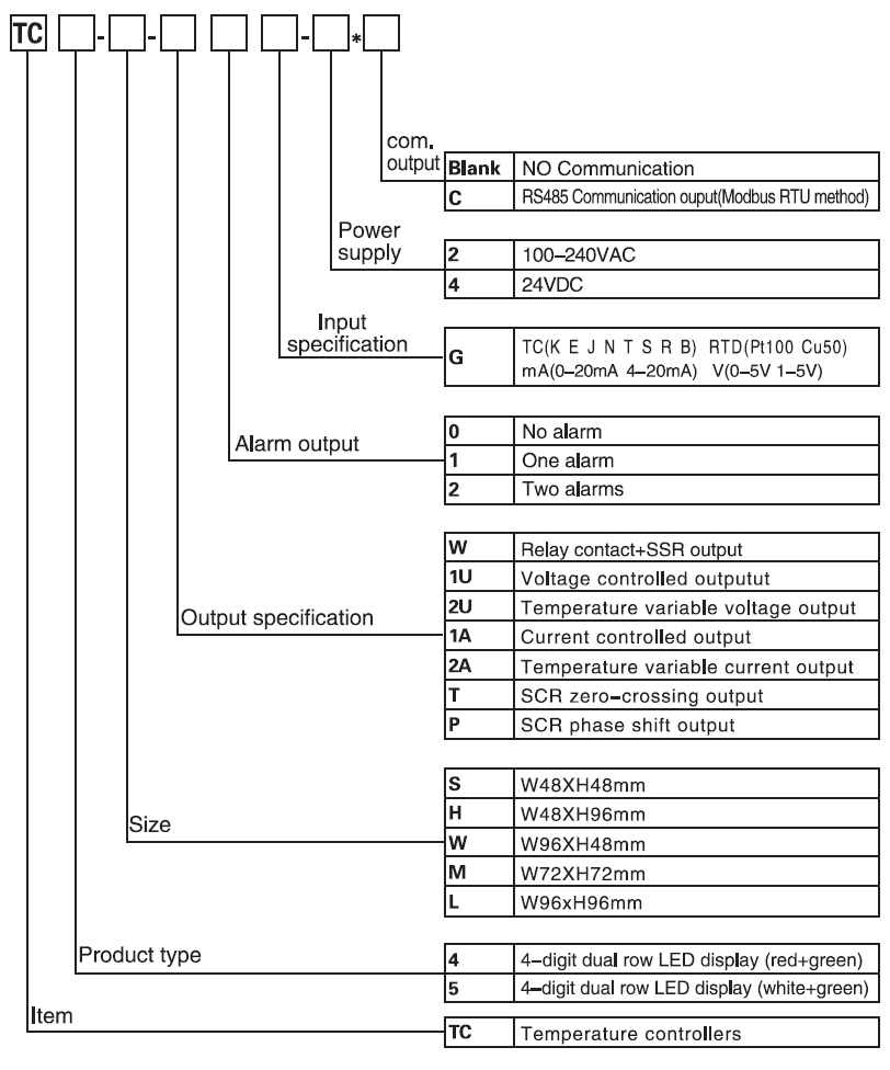 La version standard de ce modèle comprend une sortie relais + variateur SSR et une alarme. Si vous souhaitez commander un modèle 48 mm x 48 mm avec sortie relais + variateur SSR, une alarme et un contrôleur d'alimentation CA, veuillez indiquer ci-dessous la référence correspondante.