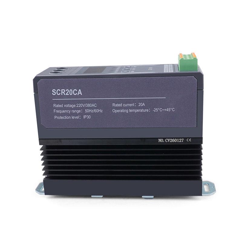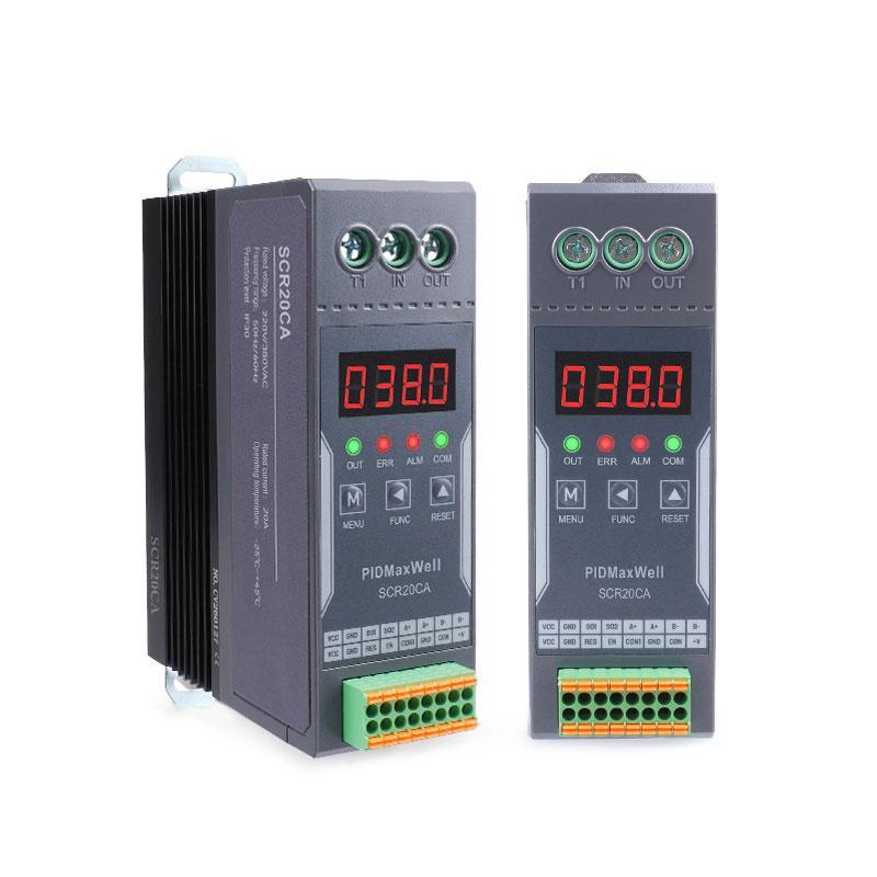 La série Maxwell SCR20CA est un contrôleur de puissance monophasé hautement intégré, conçu pour une régulation de tension précise et un contrôle par rétroaction avancé. Basé sur une puce thyristor (SCR) haute puissance, ce dispositif compact intègre un circuit de commande numérique à déphasage ainsi que des systèmes de mesure de tension et de courant de sortie de haute précision. La multifonctionnalité du SCR20CA est un atout majeur : les utilisateurs peuvent basculer facilement entre les modes de contrôle de tension constante, de courant constant et de puissance constante directement via le panneau numérique ou l’interface de communication. Doté d’un échantillonnage RMS et d’un système de mesure entièrement isolé, il garantit un fonctionnement sûr et fiable. Avec sa communication RS-485 Modbus RTU intégrée, ses bornes de commande enfichables et ses mécanismes de protection complets, le SCR20CA est la solution idéale pour les applications modernes et automatisées de chauffage et de contrôle de puissance dans l’industrie.